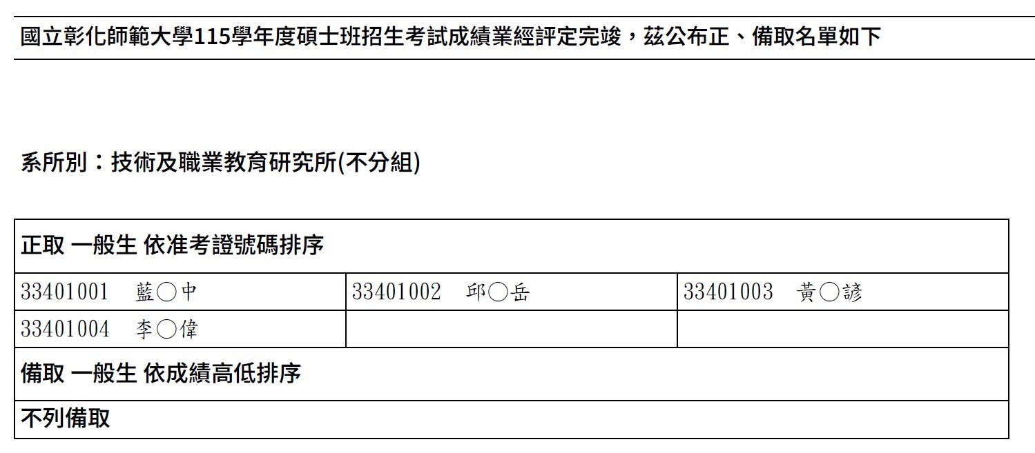 【公告】115學年度碩士班考試錄取名單